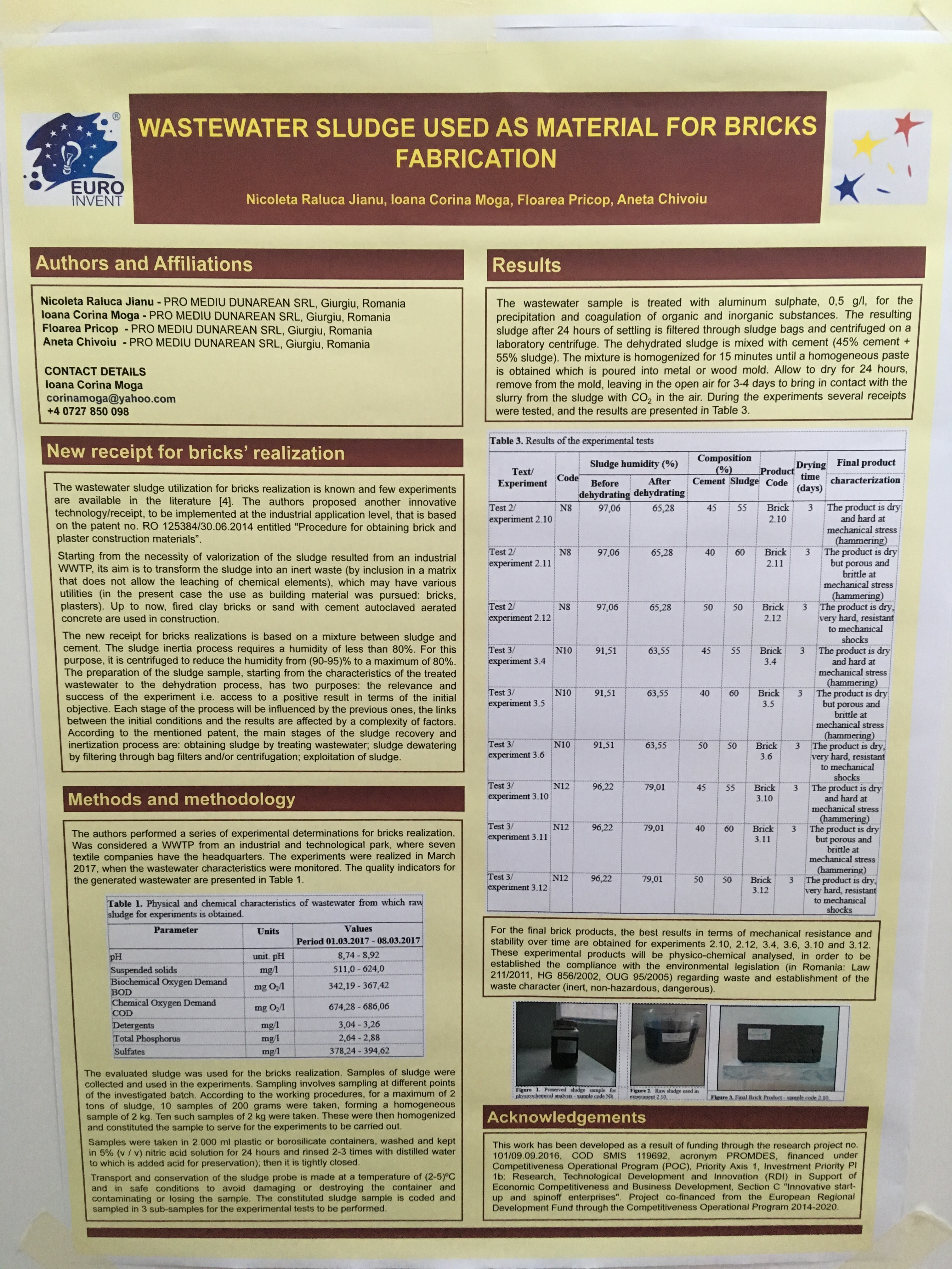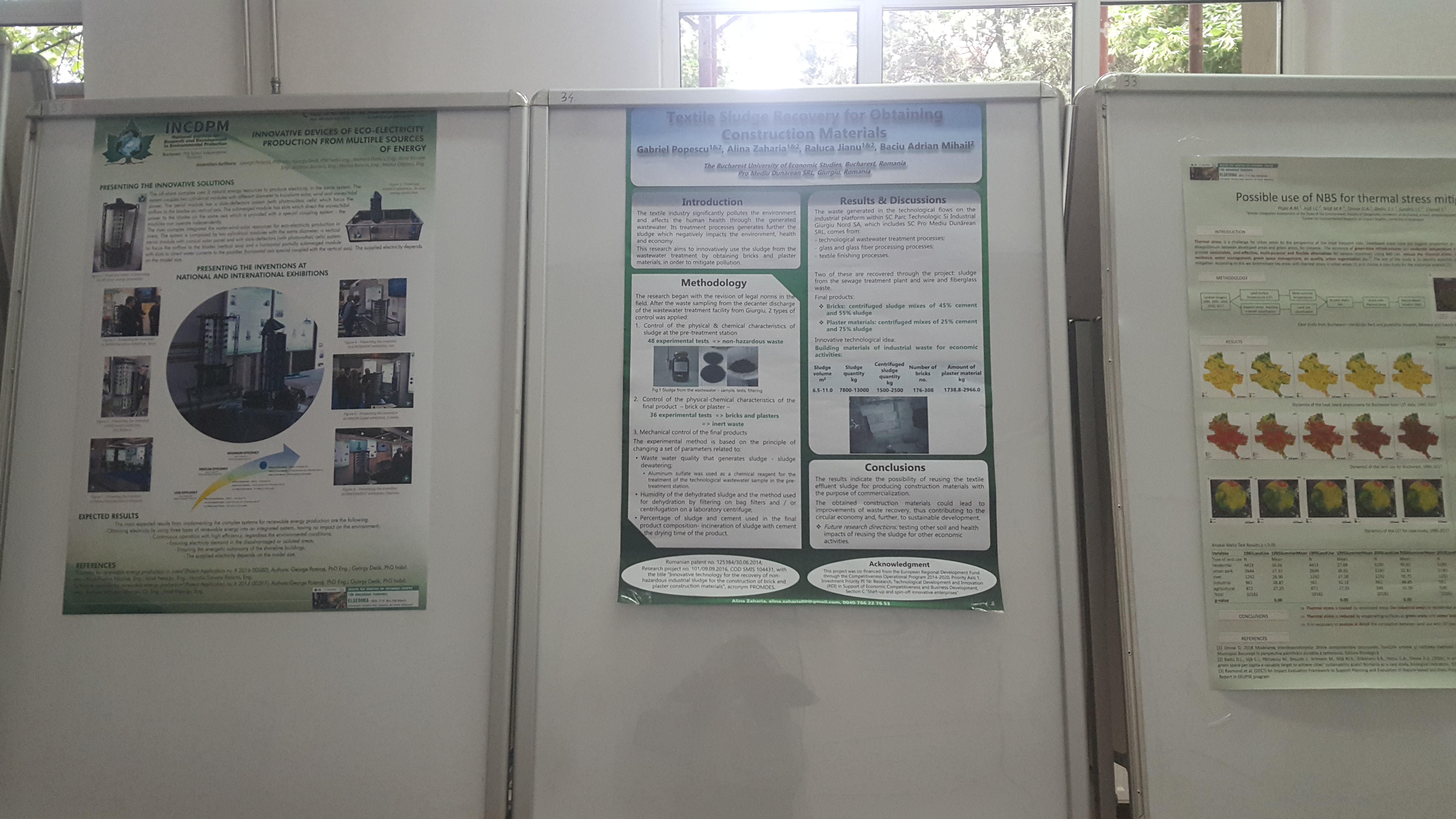 3. Gabriel POPESCU, Alina ZAHARIA, Nicoleta Raluca JIANU, Adrian Mihail BACIU, Textile sludge recovery for obtaining construction materials, ELSEDIMA International Conference – 17 – 19 May 2018, Cluj-Napoca, Romania (Prezentare poster) VEZI DOCUMENT